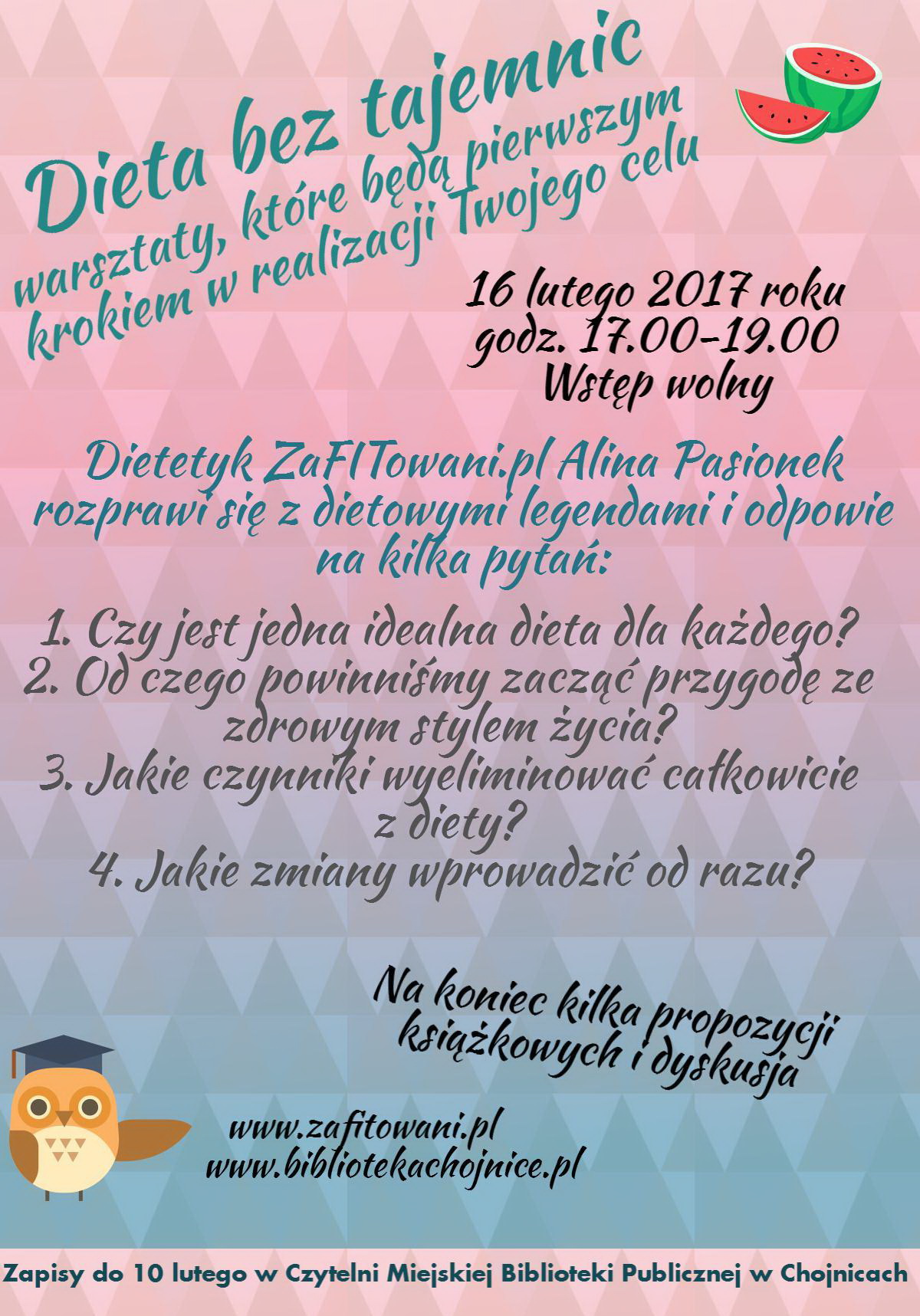 Czytelnia MBP w Chojnicach i dietetyk ZaFITowani.pl Alina Pasionek zapraszają na warsztaty dietetyczne pn. „Dieta bez tajemnic”, które odbędą się w czwartek 16 lutego 2017 roku w godz. 17.00-19.00. Wstęp wolny, a liczba miejsc ograniczona.