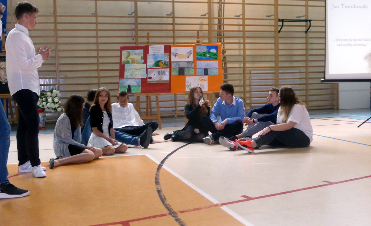 Na koniec dziennikarz zapytał spotkanych na szkolnym korytarzu gimnazjalistów o to, jak oni oceniają Jana Twardowskiego. Ci zgodnie przyznali, że trudno o lepszego patrona. Wyjaśnili, że największe wrażenie robi na nich jego pokora, a także optymizm. Cały wywiad powstał na potrzeby akademii podsumowującej odbywający się co roku tydzień z patronem.