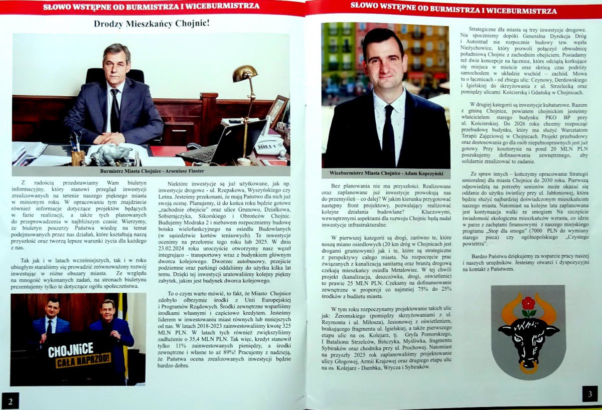 W opracowaniu tym znajdziecie również informacje dotyczące projektów będących w fazie realizacji, a także tych planowanych do przeprowadzenia w najbliższym czasie.” Wśród tych ostatnich są wymienione m.in. łącznice drogowe z ul. Ceynowy do ul. Strzeleckiej oraz z ul. Kościerskiej do ul. Gdańskiej; oraz budowa węzła Nieżychowice na obwodnicy miasta na DK 22. Na jednej ze stron w tym dziale jest zdjęcie burmistrza Arseniusza Finstera z jego zastępcą Adamem Kopczyńskim, jak wspólnie trzymają hasło o treści „Chojnice, cała naprzód!”. Pierwszy raz chojniczanie mogli je poznać podczas uroczystości (8.11.2023.) w ChCK z okazji 25 rocznicy pierwszego wyboru aktualnego burmistrza.