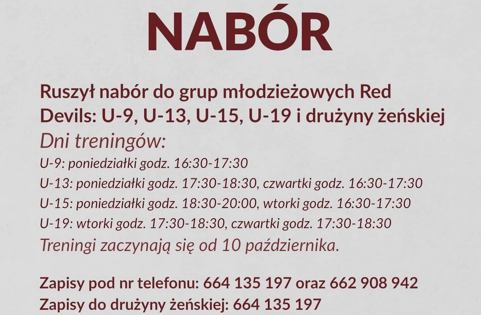 Trenując w Red Devils masz możliwość wystąpienia w barwach naszego klubu w Młodzieżowych Mistrzostwach Polski U-15 oraz U-19. Zapraszamy na treningi od 10 października w Hali Widowiskowo - Sportowej przy ulicy Hubera Wagnera 1 w Chojnicach. Więcej szczegółów na załączonej grafice.