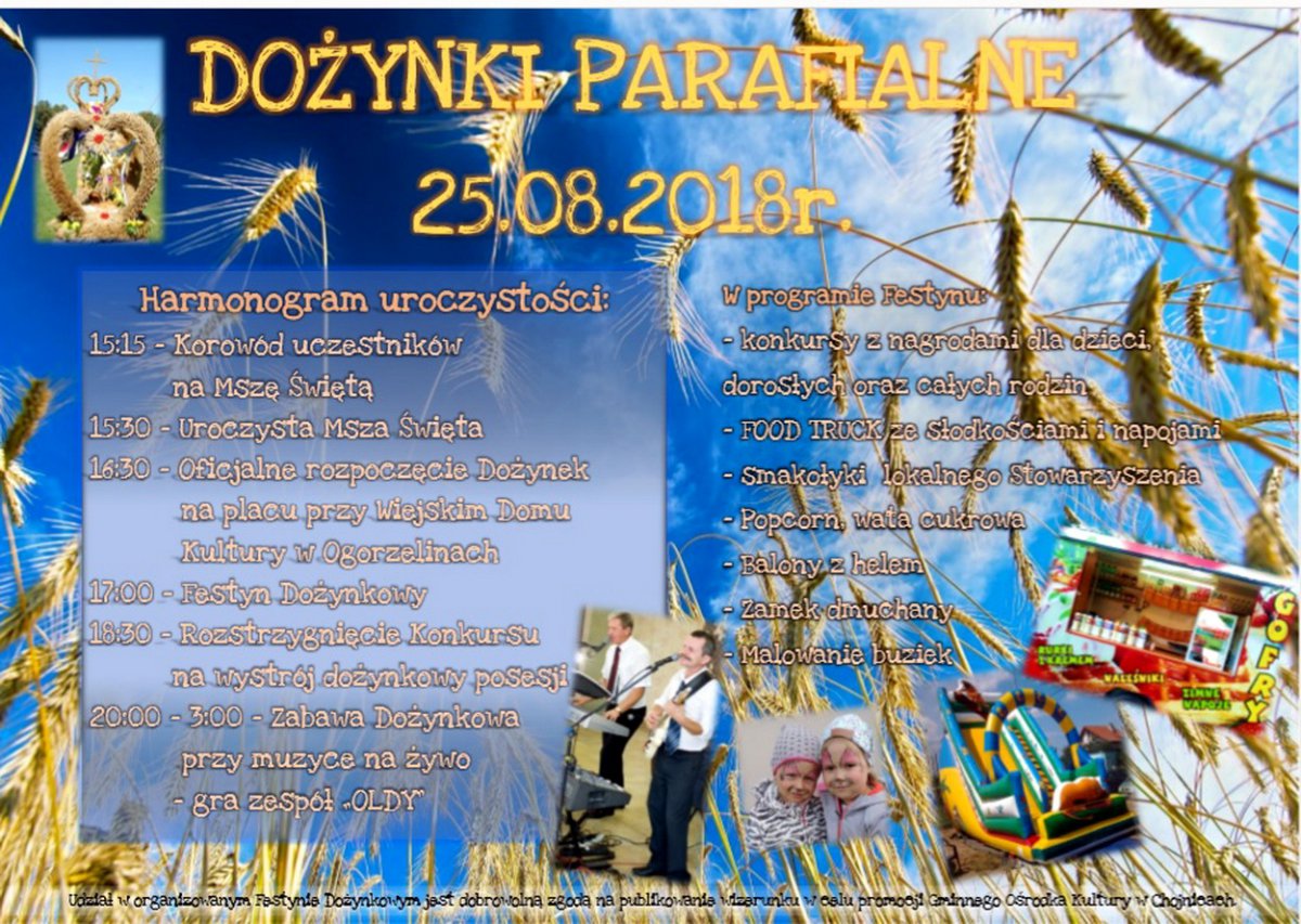 W sobotę 25 sierpnia w Ogorzelinach odbędą się dożynki parafialne sołectwa Ogorzeliny i Nowy Dwór – Cołdanki wieńczące tegoroczne żniwa. Sołeckie święto plonów rozpocznie się od uroczystej mszy świętej w miejscowym kościele parafialnym.