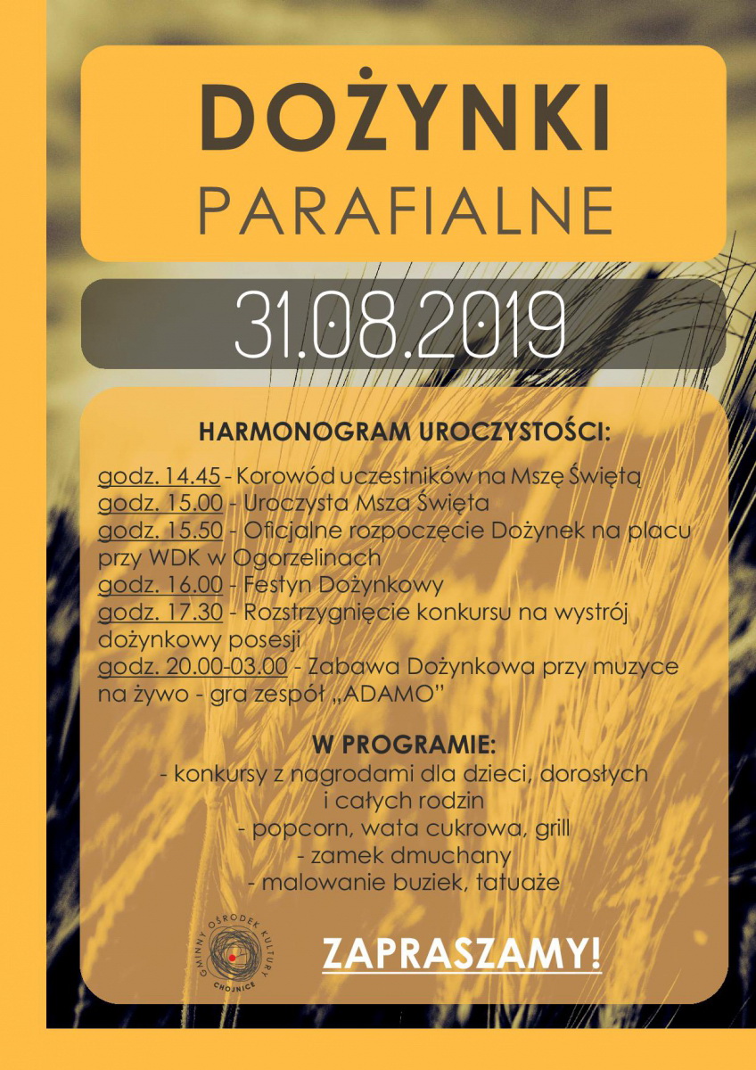 W sobotę 31 sierpnia w Ogorzelinach odbędą się dożynki parafialne sołectwa Ogorzeliny i Nowy Dwór wieńczące tegoroczne żniwa. Sołeckie święto plonów rozpocznie się od uroczystej mszy świętej w miejscowym kościele parafialnym.
