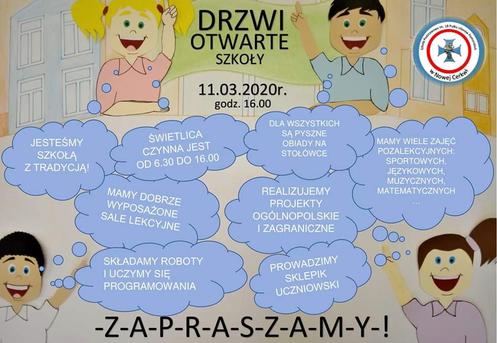 W związku z zagrożeniem rozprzestrzeniania się koronawirusa, uwzględniając rekomendacje Wojewody Pomorskiego i Pomorskiego Kuratora Oświaty informujemy,że zapowiadane na 11 marca Drzwi Otwarte Szkoły Podstawowej w Nowej Cerkwi nie odbędą się.
