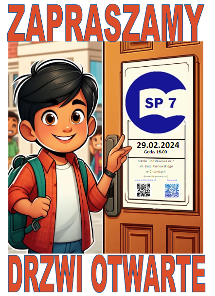 Dyrekcja i Pracownicy Szkoły Podstawowej nr 7 im. Jana Karnowskiego w Chojnicach zapraszają Rodziców i Dzieci na Drzwi Otwarte Szkoły, które odbędą się 29 lutego (czwartek) 2024 roku o godzinie 16.00 w sali gimnastycznej naszej szkoły.