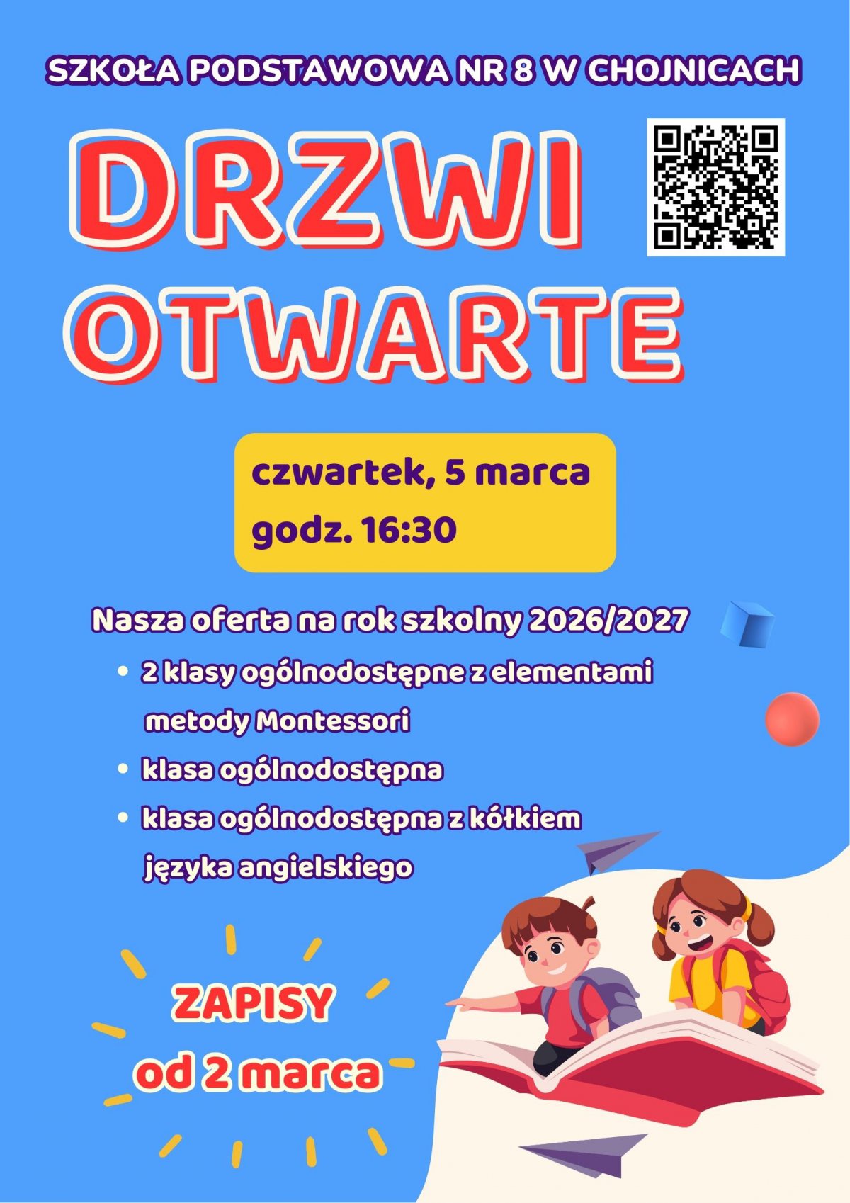W czwartek, 5 marca o godz. 16:30 w Szkole Podstawowej nr 8 odbędą się Drzwi Otwarte dla przyszłych pierwszoklasistów i ich rodziców. To doskonała okazja, by poznać ofertę edukacyjną szkoły na rok szkolny 2026/2027 i zobaczyć, czym wyróżnia się placówka.