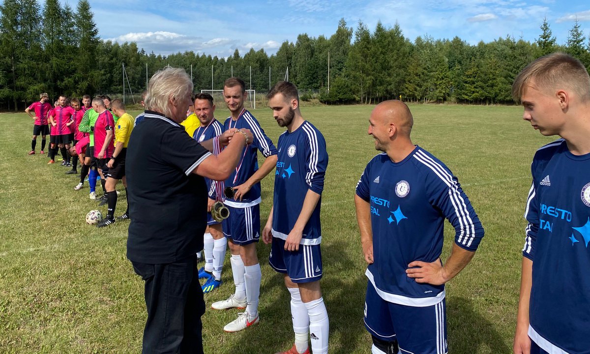 Przed meczem zawodnicy z Klawkowa otrzymali medale za awans do A klasy i puchar. Wręczył je Bogdan Duraj z pomorskiego oddziału PZPN. | fot. red.