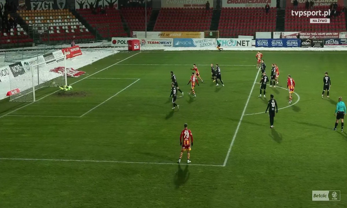 Chojniczanka po golu zdobytym w pierwszej minucie zapewniła sobie wygraną 2:1 z Resovią w końcówce podstawowego czasu. | fot. screen TVP Sport