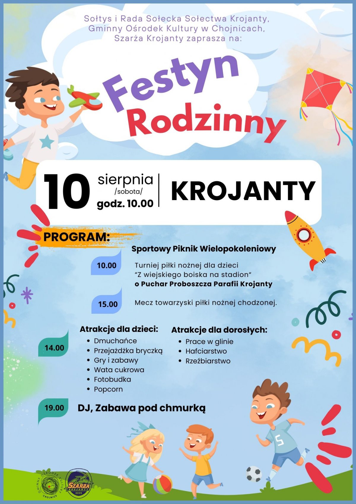 Sołectwo Krojanty, Stowarzyszenie Sportowe Szarża Krojanty, Stowarzyszenie Rozwoju Wsi Krojanty i GOK w Chojnicach zapraszają wszystkich zainteresowanych na festyn, który odbędzie się w sobotę 10 sierpnia od godz. 10.