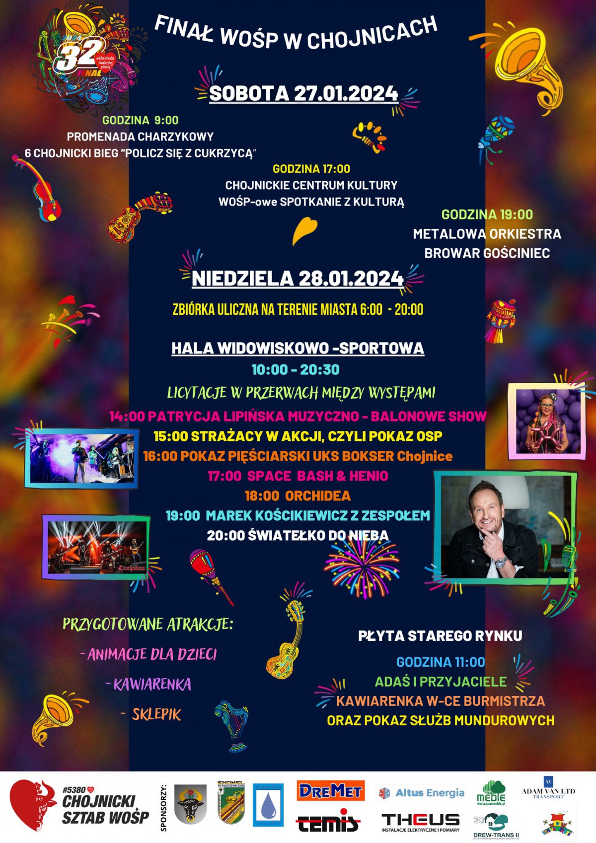 Także w sobotę 27.01 w Browarze Gościniec zagra Metalowa Orkiestra. W niedzielę 28.01 od 10.00 rozpoczną się wydarzenia Finału w miejskiej hali sportowej. Wówczas otworzy się kawiarenka oraz będą animacje dla najmłodszych. Od 14.00 na scenie wystąpią m.in. Patrycja Lipińska, bokserzy z UKS Bokser oraz Marek Kościkiewicz z zespołem. Finał zakończy tradycyjny pokaz fajerwerków pt. Światełko do nieba. Sponsoruje je jedna z lokalnych firm, a organizatorzy uzyskali od władz miasta „dyspensę” od zakazu ich urządzania poza Sylwestrem i Nowym Rokiem.