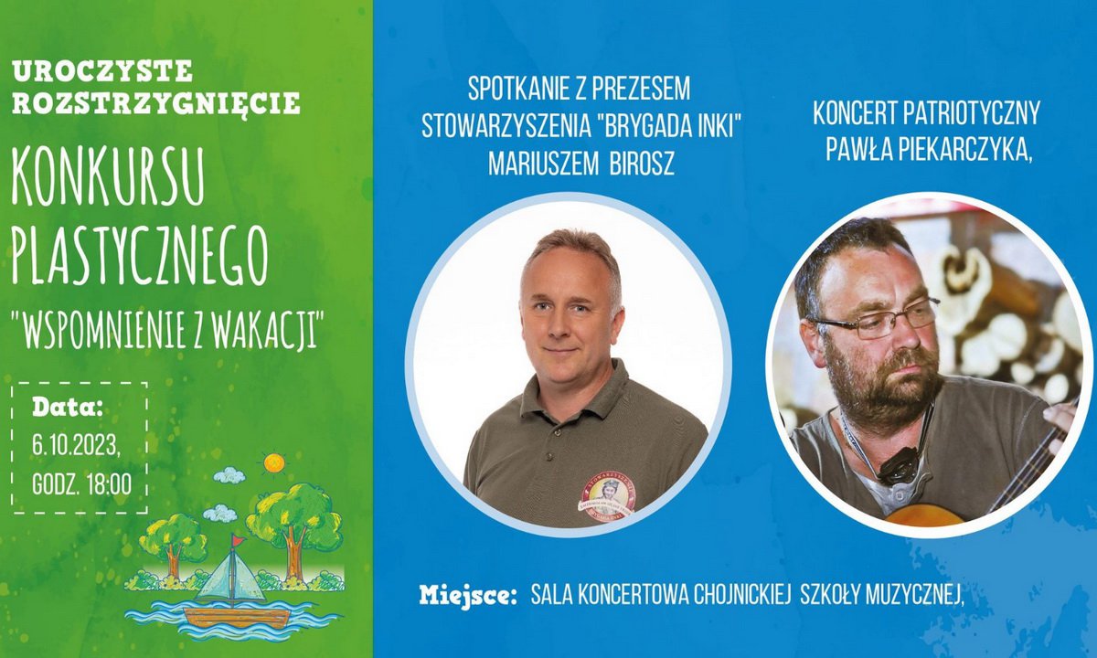 1 października 2023 10:27W programie oprócz rozstrzygnięcia Konkursu Plastycznego "Wspomnienie z Wakacji", jest także prezentacja Stowarzyszenia "Brygada Inki" przez jej prezesa Mariusza Birosza oraz koncert patriotyczny barda środowisk żołnierzy wyklętych Pawła Piekarczyka. Wstęp bezpłatny.