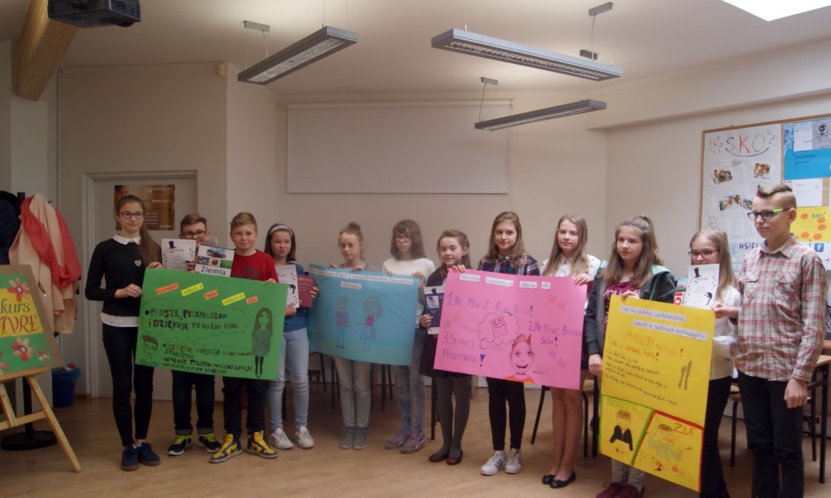 28 kwietnia 2017 11:07Zadaniem konkursowym było rozwiązanie testu i krzyżówki, odpowiedź na wylosowane pytanie, a także wykonanie plakatu na temat dobrego wychowania. Wszystkie reprezentacje pokazały wysoki poziom przygotowania, a wyniki konkursu przedstawiały się następująco: