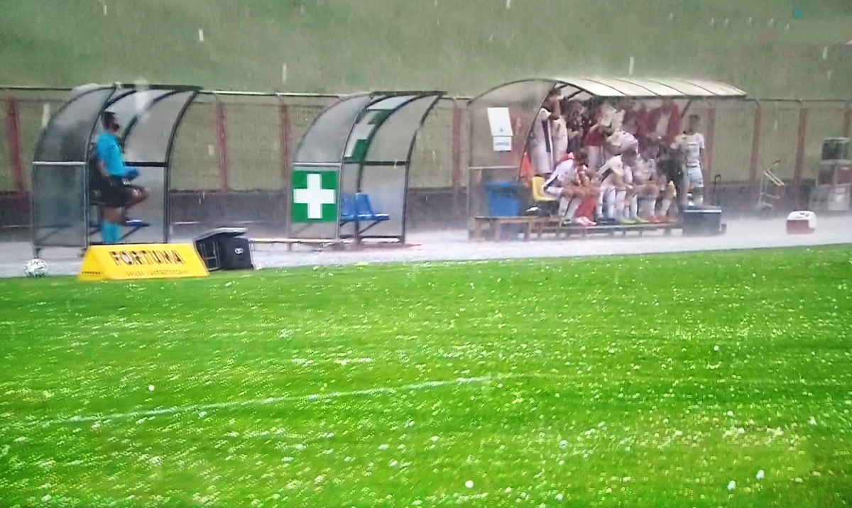 Pierwsza połowa spotkania to zdecydowana przewaga gości w posiadaniu piłki i bardzo dobra skuteczność. Już w 15 minucie Surdykowski wpisał się na listę strzelców. w 26 minucie ten sam zawodnik podwyższył na 2:0. W chwilę później nad stadionem przeszła nawałnica gradowa a sędzia był zmuszony przerwać na kilka minut mecz.
