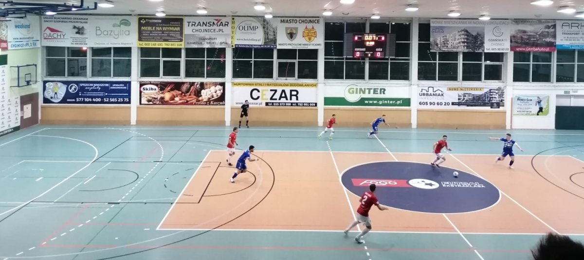 Pierwsza połowa nie zapowiadała, aby w tej statystyce mogło się cokolwiek zmienić. Oba zespoły nastawiły się na skrupulatne pilnowanie własnych bramek, efektem czego mecz przypominał raczej partię szachów, niż pojedynek futsalowy. Trybuny ożywił w 13 minucie Patryk Laskowski, który potężną bombą z dystansu dość niespodziewanie zdobył gola dla chojniczan. Zmotywowało to przyjezdnych, którzy jednak nie znaleźli sposobu na znakomicie dysponowanego Pavlo Puchkę.