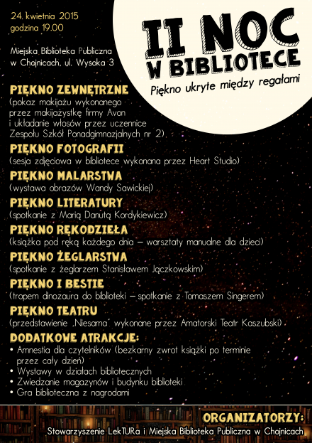 Po raz drugi Stowarzyszenie LekTURa i Miejska Biblioteka Publiczna w Chojnicach zapraszają mieszkańców Chojnic i powiatu do udziału w Nocy w Bibliotece pn. Piękno ukryte między regałami. Tegoroczna edycja odbędzie się w piątek 24 kwietnia od godz. 19:00.
