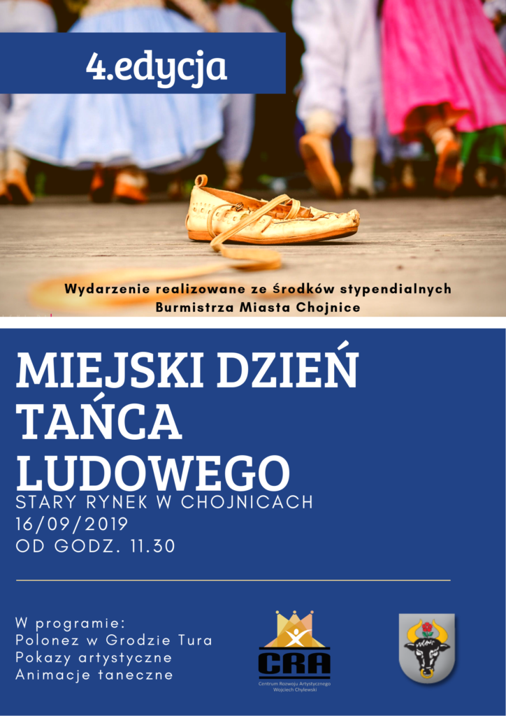 IV Miejski Dzień Tańca Ludowego odbędzie się w poniedziałek, 16 września, od godz. 11.30 na chojnickim Starym Rynku. Przy zaangażowaniu lokalnych szkół, przedszkoli i stowarzyszeń przestrzeń Rynku opanuje dziecięca radość i energia. Wszystko okraszone paletą kolorów i oczywiście tańcem ludowym. III Miejski Dzień Tańca Ludowego był elementem miejskich obchodów 100- lecia odzyskania niepodległości przez Polskę. IV edycja wydarzenia poprzedza rocznicę powrotu Chojnic do Macierzy (1920-2020).