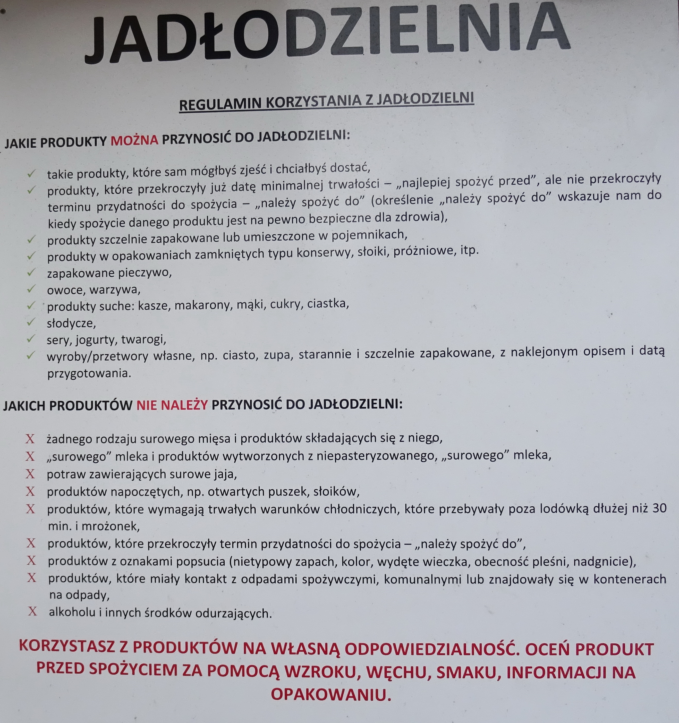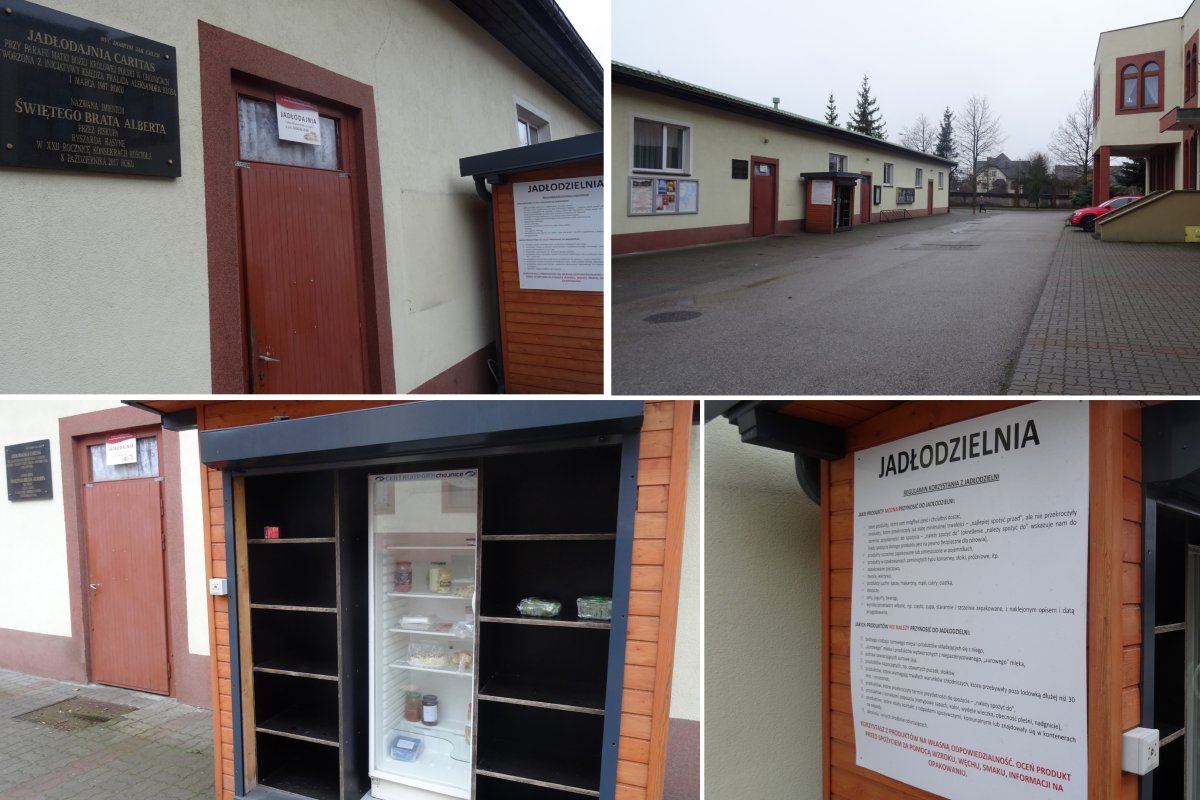 Oprócz szafek z półkami ma też ladę chłodniczą, gdzie teraz po świętach Bożego Narodzenia chojniczanie mogą zostawiać potrawy, które im pozostały. Jak wynika z regulaminu umieszczonego przy jadłodzielni, można tam zostawić produkty, które sami byśmy wzięli i zjedli; szczelnie zapakowane lub w pojemnikach, konserwach czy w słoikach; także owoce i warzywa; produkty suche, jak kasze, makarony czy ciastka. Także własne przetwory jak ciasto czy zupa, szczelnie zapakowane z umieszczoną datą przygotowania i opisem.