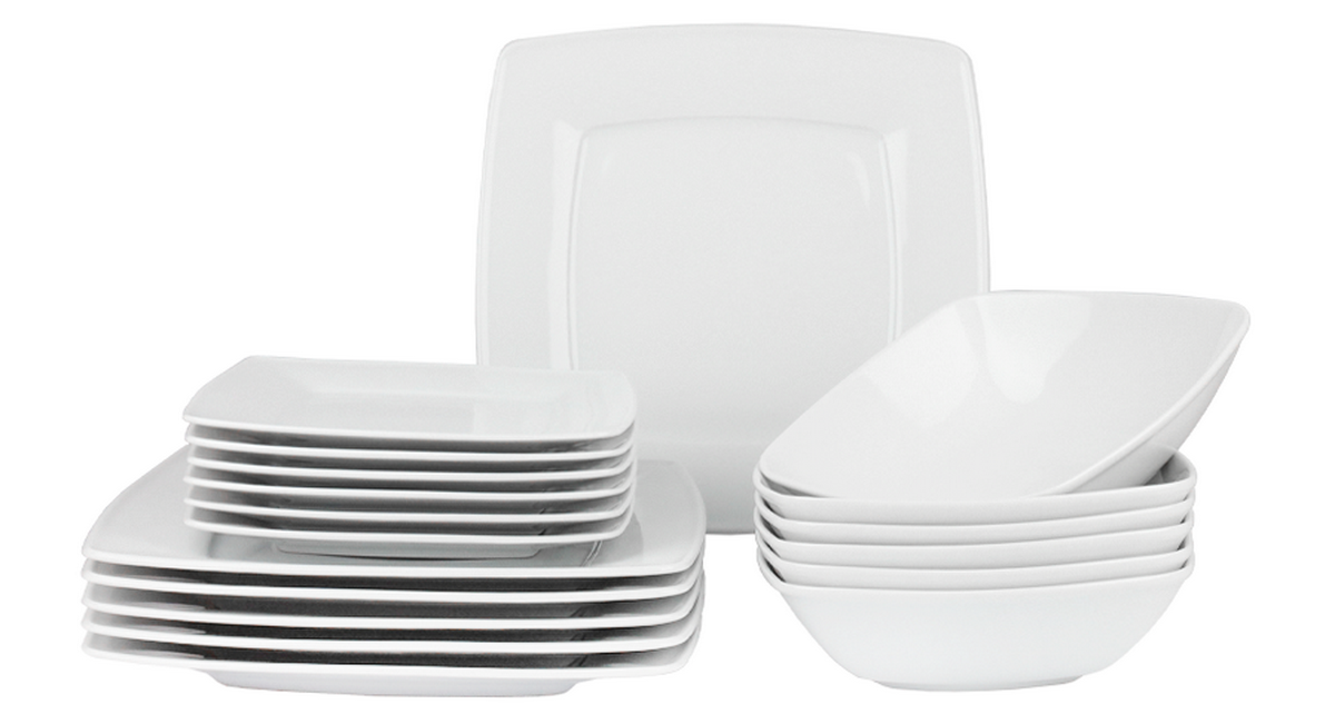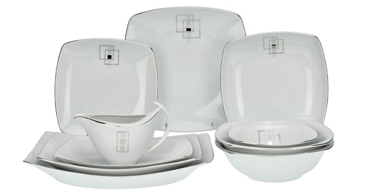 Zestawy tego typu zawierają kwadratowe miseczki, talerzyki deserowe oraz obiadowe, czasem jeszcze można dokupić pasujący zestaw kawowy oraz kubki.