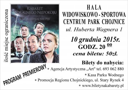 2 grudnia 2015 10:38Kabaret Moralnego Niepokoju oraz Agencja Artystyczna ART zaprasza Państwa na premierowy program „Jerzyk dzisiaj nie pije”. Występ odbędzie się 10 grudnia br o godz. 20:00 w hali Centrum Park w Chojnicach.