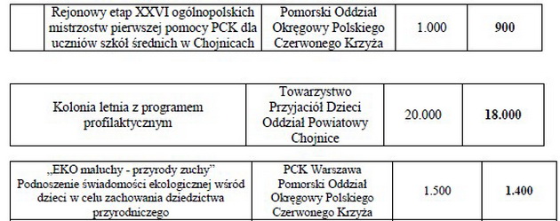 Najniższa przyznana kwota to 500 zł dla Polskiego Związku Głuchych na spotkanie kulturalno – integracyjne związane z obchodami Świąt Bożego Narodzenia, a najwyższa, nie licząc tych na dwa wspomniane zespoły kaszubskie to 18 tys. na letnią kolonię dla dzieci z programem profilaktycznym organizowaną przez TPD.