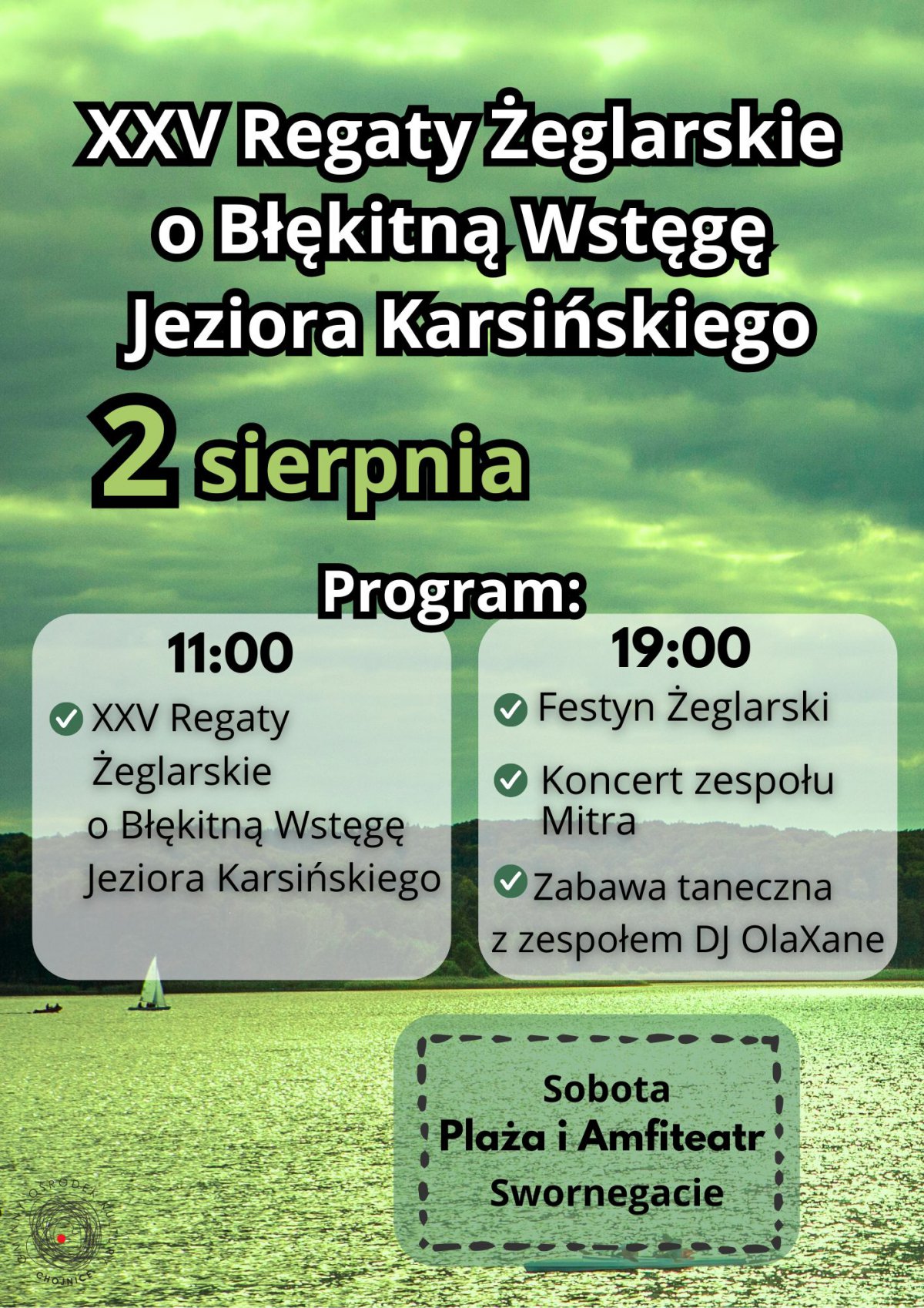 W najbliższą sobotę 2 sierpnia na jeziorze Karsińskim w Swornegaciach odbędą się XXV regaty o Błękitną Wstęgę tego akwenu. Otwarcie na plaży o godzinie 11.00. W pobliskim amfiteatrze wieczorem o 19.00 rozpocznie się festyn żeglarski.
