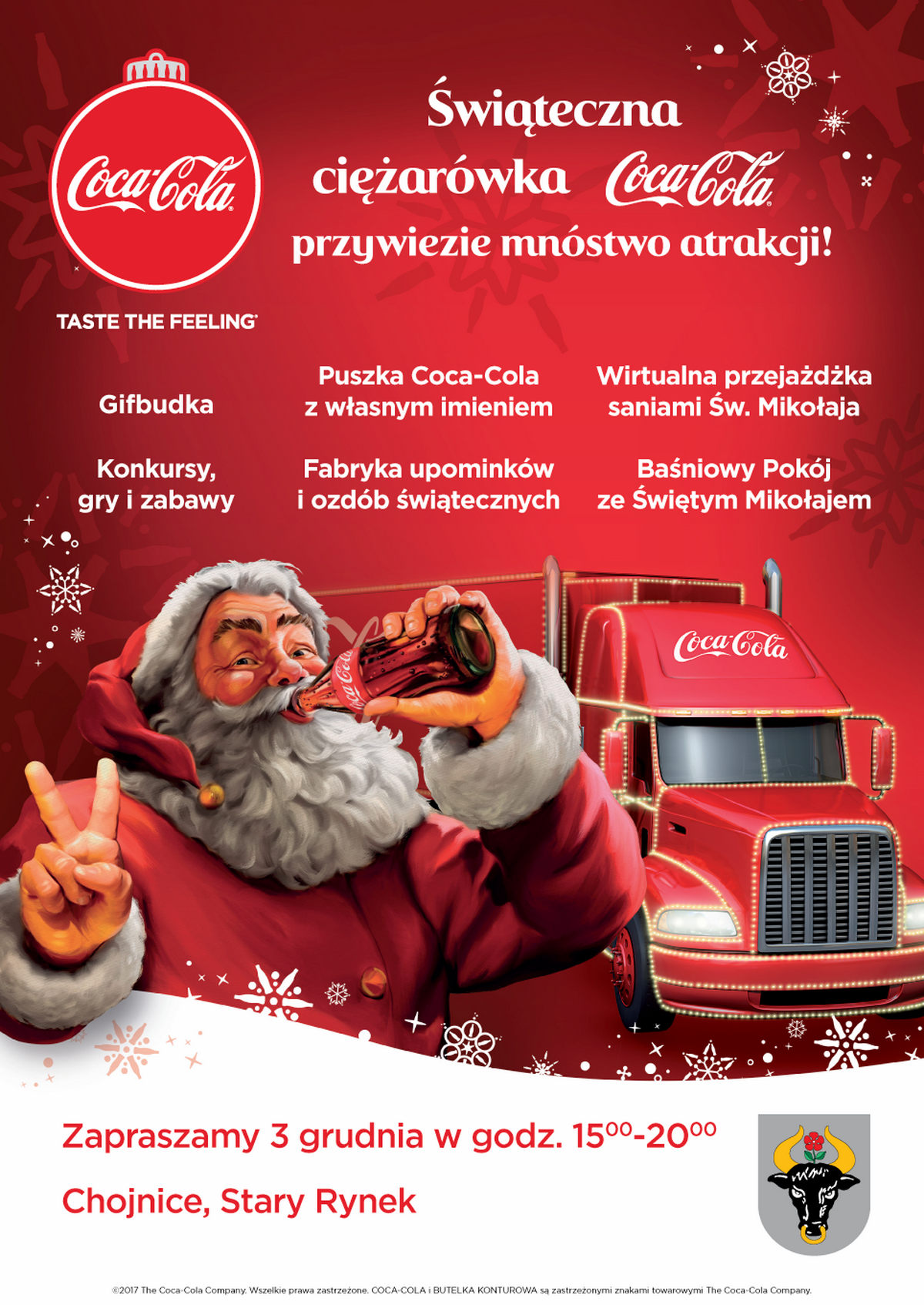 15 listopada 2017 13:45Podczas eventów w ciągu tygodnia Coca-Cola zaprasza do wspólnej zabawy z rodziną i znajomymi. Będzie można m.in. zrobić zdjęcie w klimatycznym Pokoju Świętego Mikołaja, własnoręcznie przygotować prezent w fabryce upominków, wysłać bliskim pocztówkę z życzeniami ze zdjęciem zrobionym w GIF budce czy przygotować spersonalizowaną puszkę Coca - Cola.