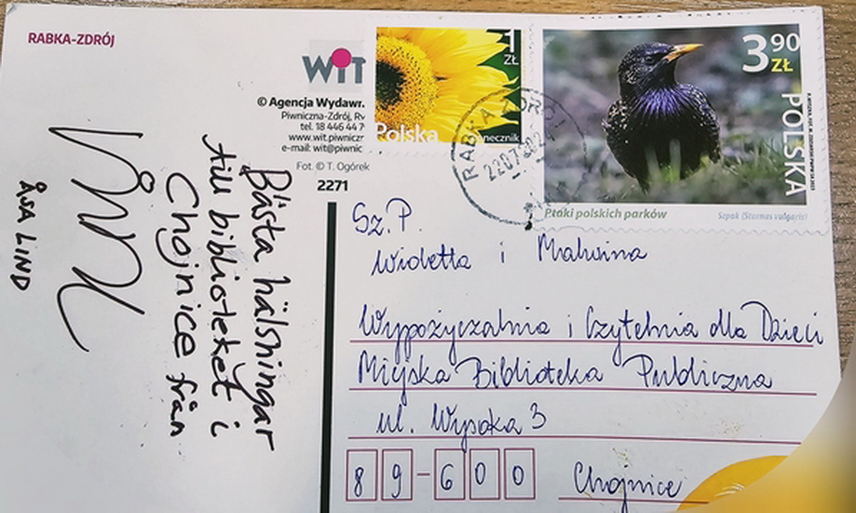 Do Miejskiej Biblioteki Publicznej w Chojnicach dotarła kartka z pozdrowieniami od czytelnika Wypożyczalni i Czytelni dla Dzieci, zawierająca niespodziankę w postaci autografu bardzo znanej pisarki Åsy Lind.