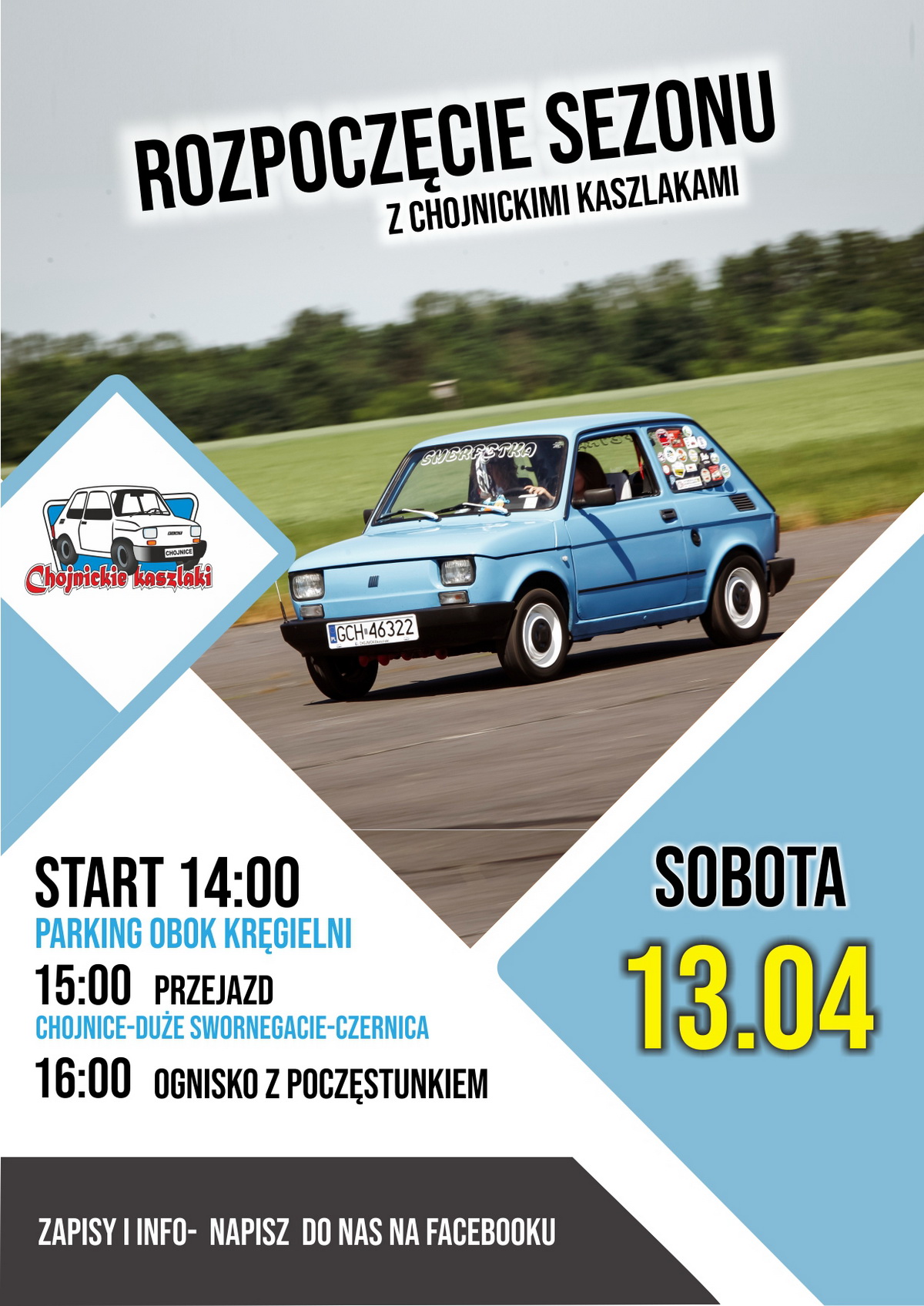 W sobotę (13.04) Chojnickie Kaszlaki organizują rozpoczęcie sezonu Fiata 126p. Zaczynamy o godz. 14.00 na parkingu obok kręgielni, gdzie przez godzinę będzie można zobaczyć zarówno klubowe maluchy, jak i auta naszych gości.