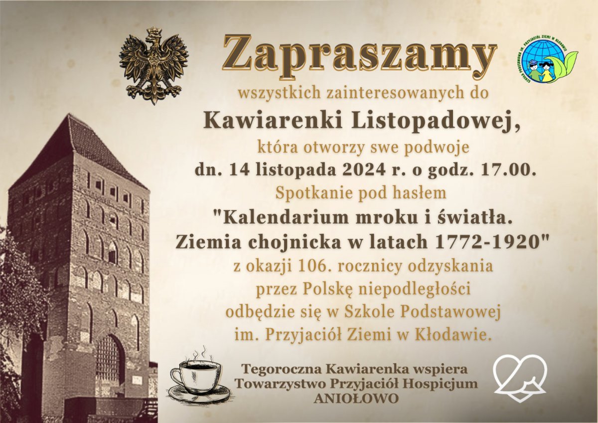 Kolejny raz społeczność Szkoły Podstawowej im. Przyjaciół Ziemi w Kłodawie organizuje z okazji rocznicy odzyskania przez Polskę niepodległości Kawiarenkę Listopadową. Odbędzie się 14 listopada (czwartek) o godzinie 17.00.