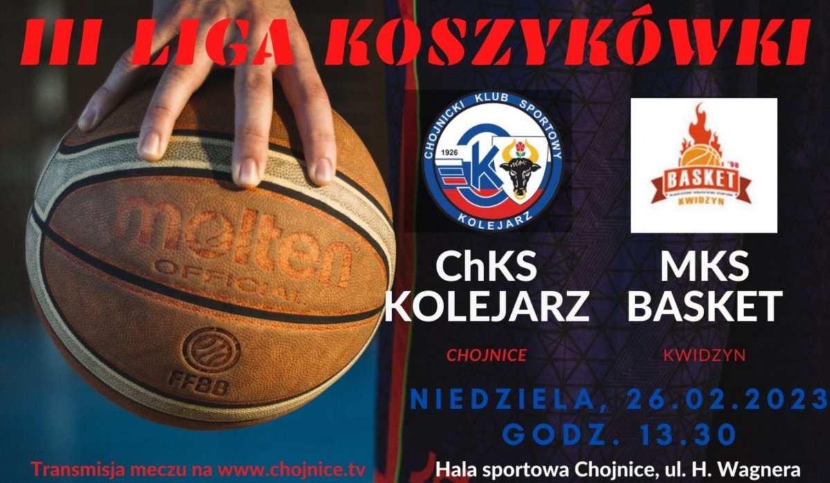 W niedzielę 26 lutego o godzinie 13.30 rozpocznie się kolejny mecz koszykówki w III lidze zespołu Kolejarza Chojnice. Przeciwnikiem będzie drużyna MKS Basket Kwidzyn. Wstęp wolny.