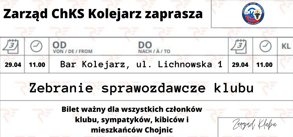 Zarząd Chojnickiego Klubu Sportowego Kolejarz Chojnice informuje członków, zawodników, trenerów, kibiców, sympatyków i mieszkańców, iż 29 kwietnia (sobota) o godz. 11.00 odbędzie się zebranie sprawozdawcze klubu za 2022 rok.