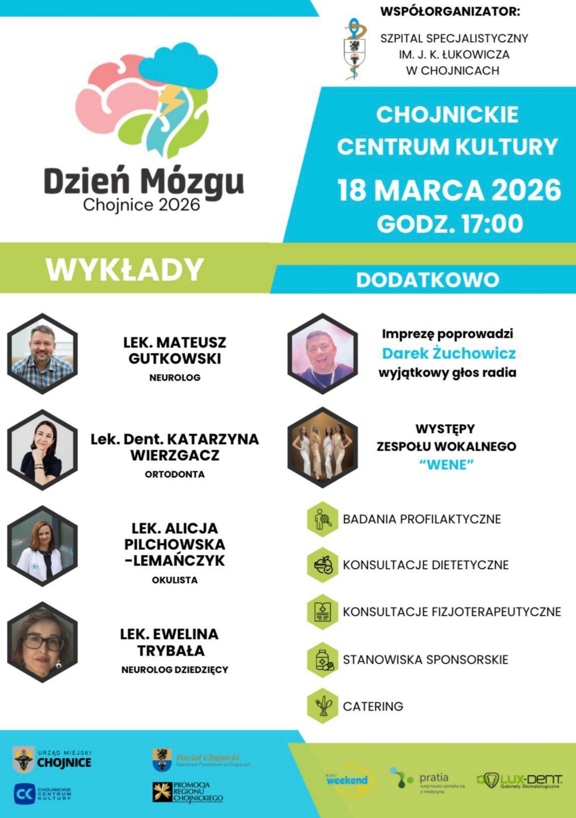 W programie zaplanowano serię wystąpień przygotowanych przez doświadczonych ekspertów z różnych dziedzin medycyny. Swoją wiedzą i praktycznym doświadczeniem podzielą się: neurolog Mateusz Gutkowski, ortodontka Katarzyna Wierzgacz, okulistka Alicja Plichowska-Lemańczyk oraz neurolog dziecięca Ewelina Trybała. Podczas prelekcji uczestnicy będą mogli dowiedzieć się m.in., jak styl życia wpływa na pracę mózgu, w jaki sposób zapobiegać problemom neurologicznym oraz jak dbać o zdrowie układu nerwowego na różnych etapach życia.