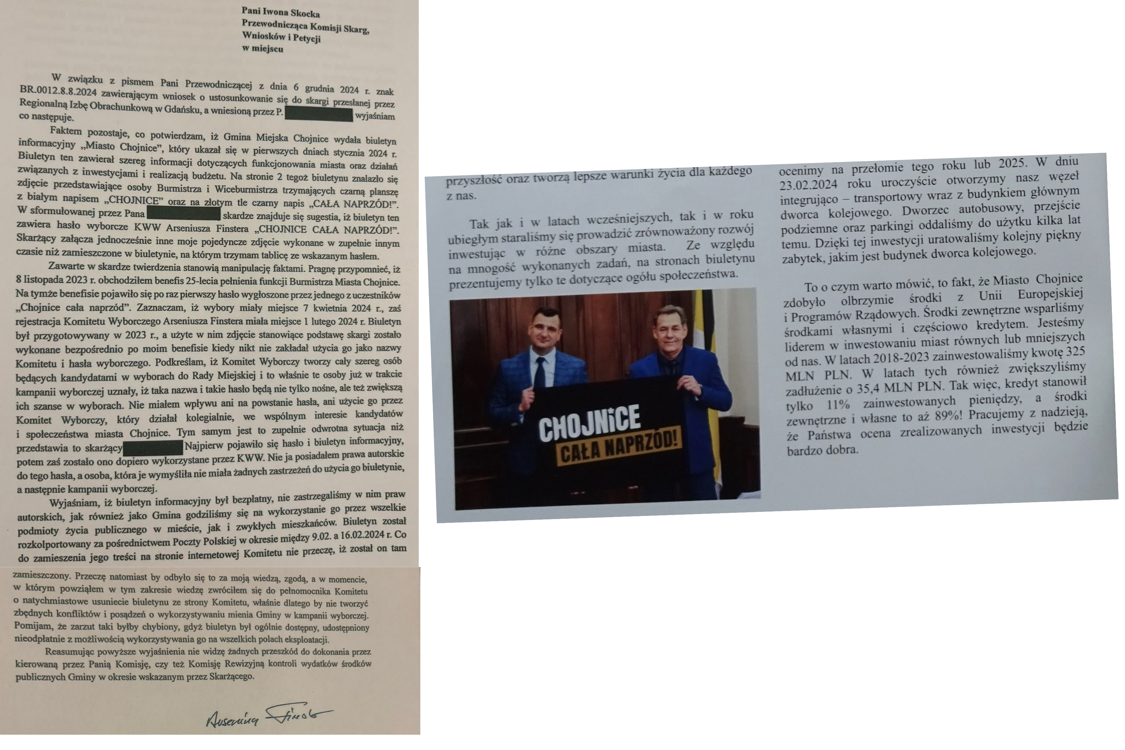 RIO odmówiła rozpatrzenia wniosku i przekazała pismo do przewodniczącego RM Chojnic, prosząc o poinformowanie jej o decyzji RM w tejże sprawie. Komisja Petycji i Skarg rozpatrzyła skargę Michała Gruchały w dniu 20.12.2024. Jej członkowie otrzymali pisemne stanowisko burmistrza Arseniusza Finstera ws. zarzutów zawartych w skardze. Wyjaśnił w niej, że „Zawarte w skardze twierdzenia stanowią manipulację faktami. Pragnę przypomnieć, iż 8.11.2023 obchodziłem benefis 25-lecia pełnienia funkcji Burmistrza Miasta Chojnice. Tam pojawiło się po raz pierwszy hasło wygłoszone przez jednego z uczestników „Chojnice cała naprzód”. Zaznaczam, iż wybory miały miejsce 7.04.2024, a rejestracja KWW Arseniusza Finstera miała miejsce 1.02.2024.” Ponadto w wyjaśnieniach burmistrza jest stwierdzenie, że biuletyn był kolportowany w dniach 9.02-16.02.2024; oraz że ukazał się w pierwszych dniach stycznia 2024.