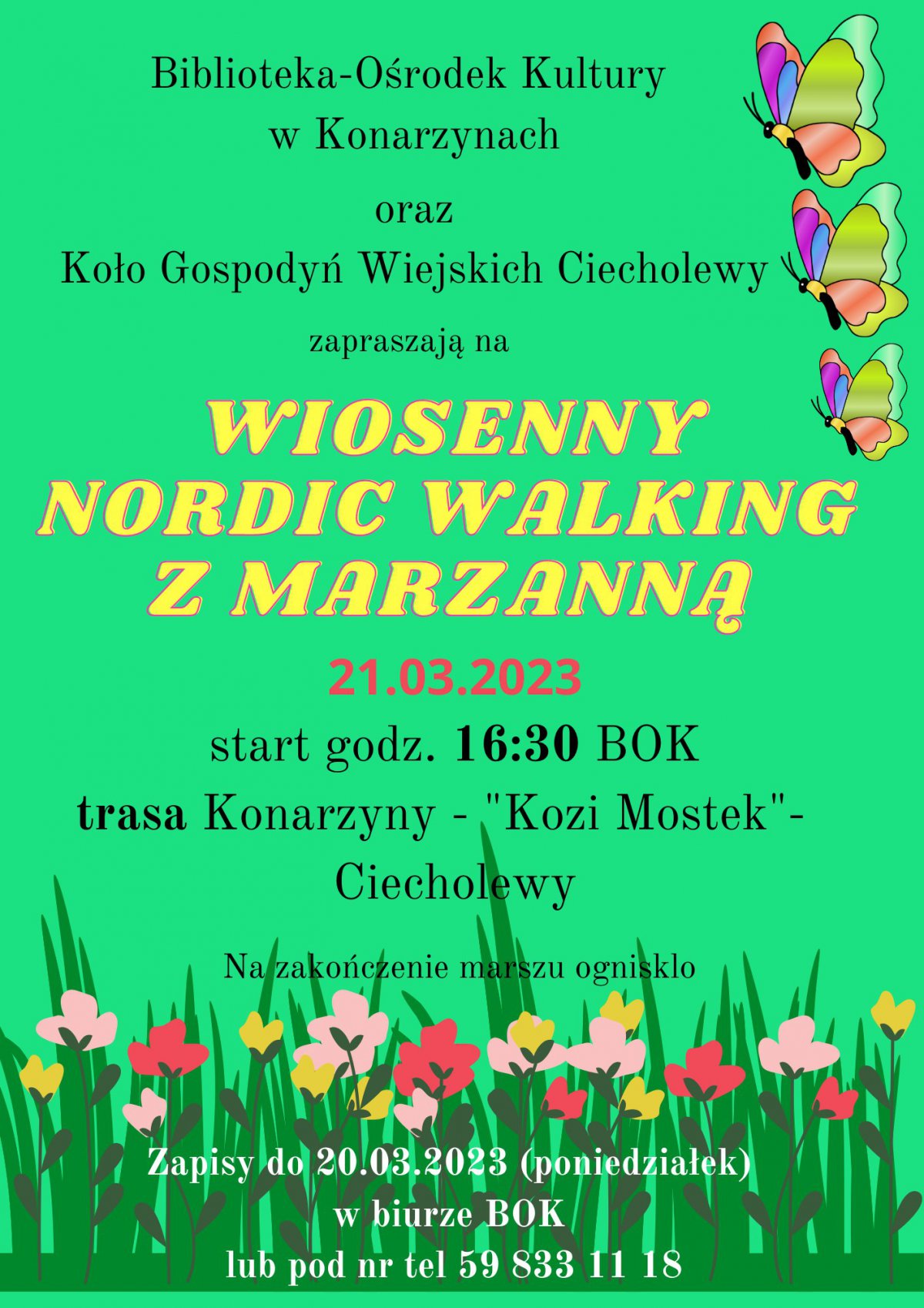 Biblioteka – Ośrodek Kultury w Konarzynach oraz KGW Ciecholewy planują powitać Wiosnę 2023 podczas Wiosennego Nordic Walking z Marzanną. Zbiórka we wtorek 21 marca o godzinie 16.30 przy siedzibie B-OK w Konarzynach.