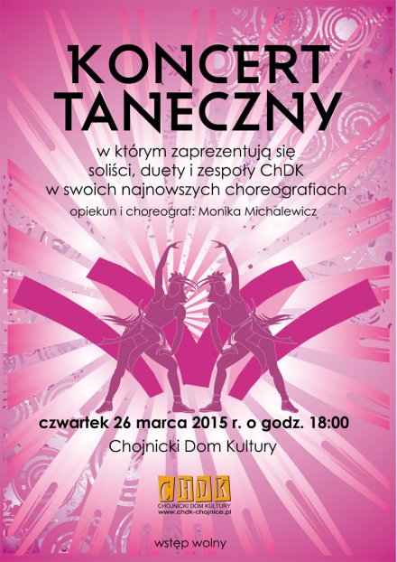 Chojnicki Dom Kultury zaprasza w czwartek 26 marca o godz. 18:00 na koncert taneczny, w którym zaprezentują się soliści, duety i zespoły ChDK w swoich najnowszych choreografiach.