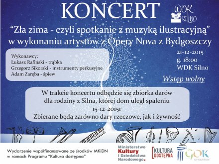 Wiejski Dom Kultury w Silnie zaprasza miłośników muzyki na Koncert Zimowy, w trakcie którego będą zbierane dary i żywność dla rodziny, której dom w dniu wczorajszym uległ spaleniu.