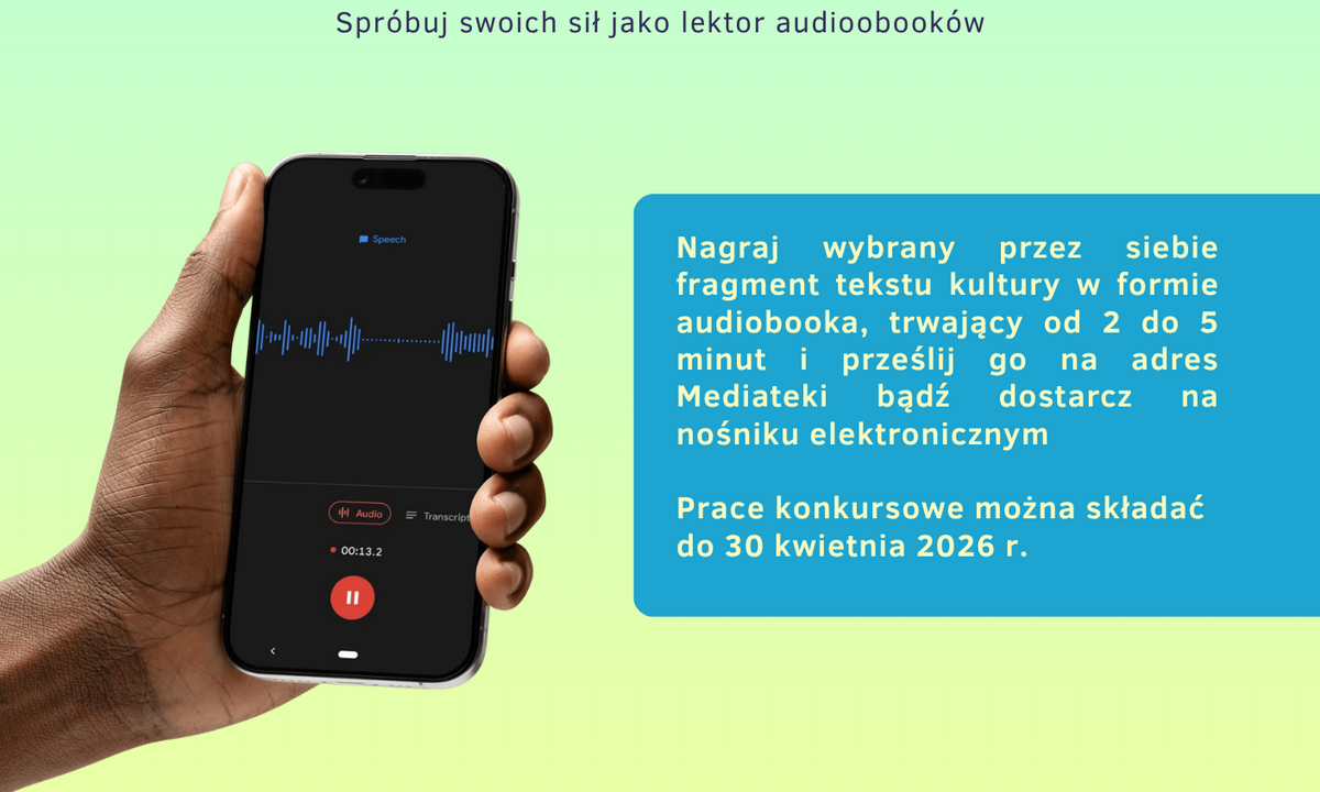 Stowarzyszenie LekTURa i Miejska Biblioteka Publiczna w Chojnicach zapraszają dzieci, młodzież i dorosłych do nagrania własnego audiobooka. Nagranie można przygotować samodzielnie bądź w grupie.