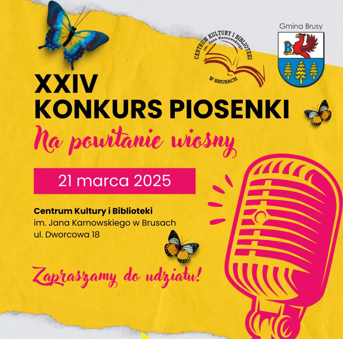 CKiB im. J. Karnowskiego w Brusach zaprasza młodych wokalistów do udziału w XXIV Konkursie Piosenki „Na powitanie wiosny”. Odbędzie się 21 marca. Będzie można zaprezentować swoje umiejętności wokalne, rozwijać pasję do muzyki i poczuć radość śpiewania.
