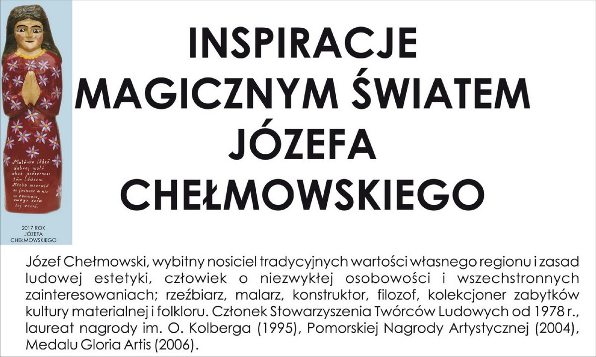 15 września 2017 12:03Józef Chełmowski - wybitny nosiciel tradycyjnych wartości własnego regionu i zasad ludowej estetyki, człowiek o niezwykłej osobowości i wszechstronnych zainteresowaniach: rzeźbiarz, malarz, konstruktor, filozof, kolekcjoner zabytków kultury materialnej i folkloru.