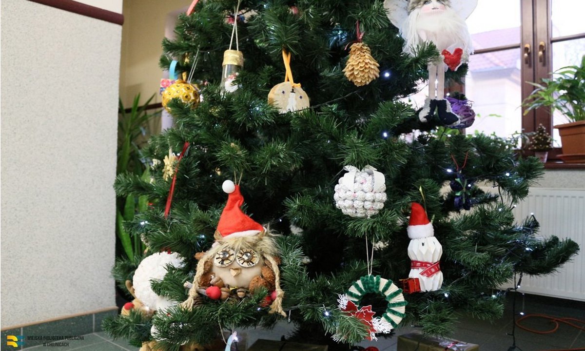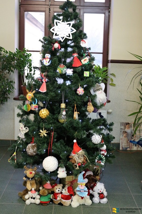 Przyniesione ozdoby można podziwiać na choince, która znajduje się w holu na I piętrze budynku biblioteki. | fot. MBP