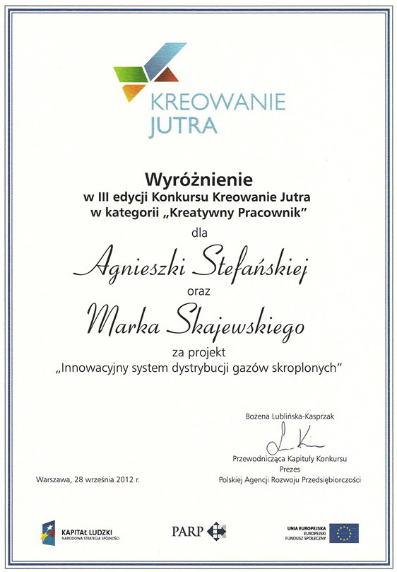 W III edycji Konkursu „Kreowanie Jutra” wyróżnienie otrzymał zespół pracowników z firmy Spawmet, Agnieszka Stefańska i Marek Skajewski, za nowatorski sposób obniżania kosztów i czasu dystrybucji gazów, a także za wymierny efekt ekonomiczny projektu „Innowacyjny system dystrybucji gazów skroplonych”.