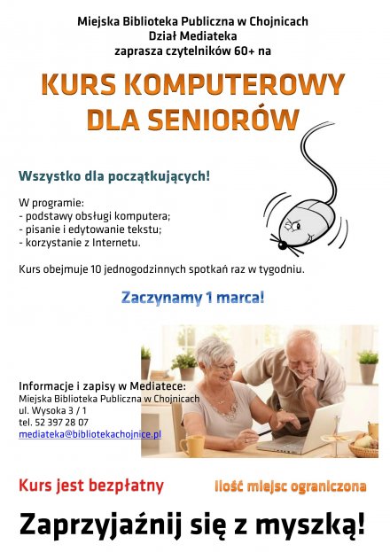 Mediateka Miejskiej Biblioteki Publicznej w Chojnicach zaprasza seniorów na kurs podstawowej obsługi komputera i Internetu. Kurs jest bezpłatny, a liczba miejsc ograniczona.