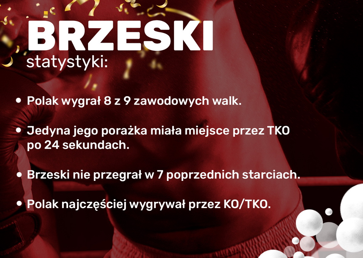 Łukasz Brzeski to 30-letni zawodnik, który w Polsce zaprezentował się głównie podczas walki dla federacji Babilon. Polak zdecydował się na udział w Dana White's Contender Series i był to krok zwrotny w jego karierze. Dostał swoją życiową szansę, która postara się wykorzystać. Łącznie podczas swojej kariery stoczył 11 zawodowych walk. 8 z nich zakończyło się jego zwycięstwem, jedna porażką, a w przypadku 2 pozostałych mieliśmy remis, a także wcześniej wspominaną zmianę na No Contest, jednak Polak w oktagonie pokonał swojego przeciwnika, a decyzja została zmieniona po wykryciu niedozwolonych środków.