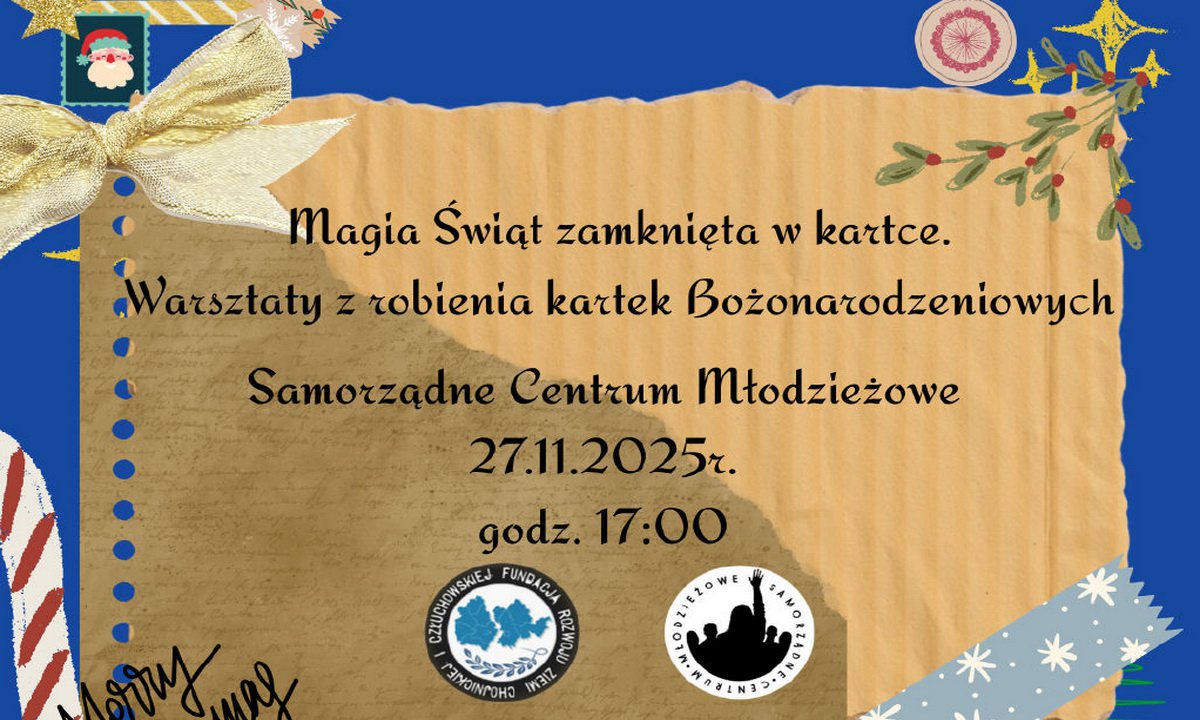 Wolontariusze Fundacji Rozwoju Ziemi Chojnickiej i Człuchowskiej zapraszają na warsztaty z robienia kartek Bożonarodzeniowych. Spotkanie odbędzie się w czwartek, 27 listopada w Samorządnym Centrum Młodzieżowym przy ul. Koszarowej 8 w Chojnicach. Start o godz. 17:00! Część stworzonych prac rozdamy na chojnickim rynku po zakończeniu spotkania. Zrobimy to w ramach promocji idei wysyłania i wręczania kartek zamiast wysyłania SMS-ów. Razem z nami obudź ducha świąt oraz powrót do tradycji.