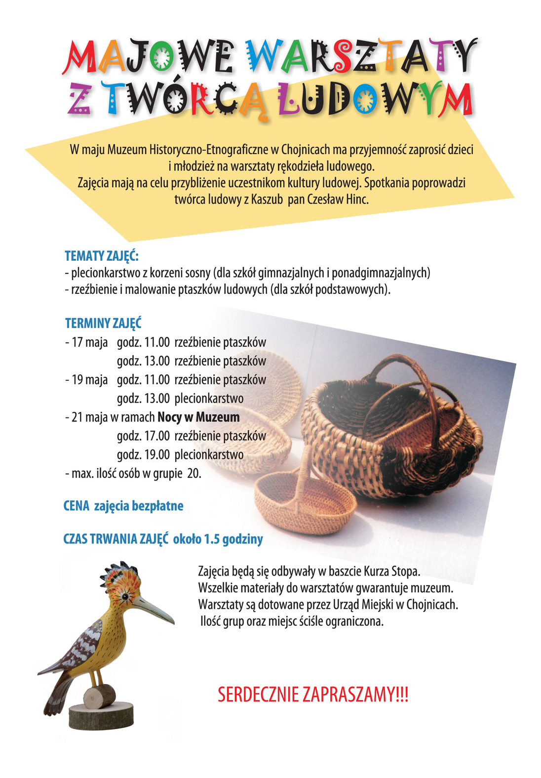 Muzeum Historyczno - Etnograficzne w Chojnicach zaprasza na Majowe Warsztaty z twórcą ludowym. Tego typu zajęcia mają na celu upowszechnianie wiedzy o tradycji ludowej.