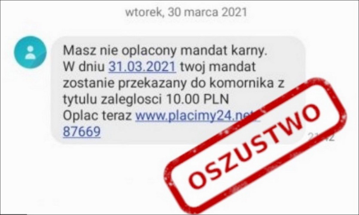 "Masz nie oplacony mandat karny. W dniu 31.03.2021 twoj mandat zostanie przekazany do komornika z tytulu zaleglosci 10.00 PLN. Oplac teraz" (pisownia oryginalna). SMS-y takiej treści pojawiły się u niektórych odbiorców. To oszustwo.