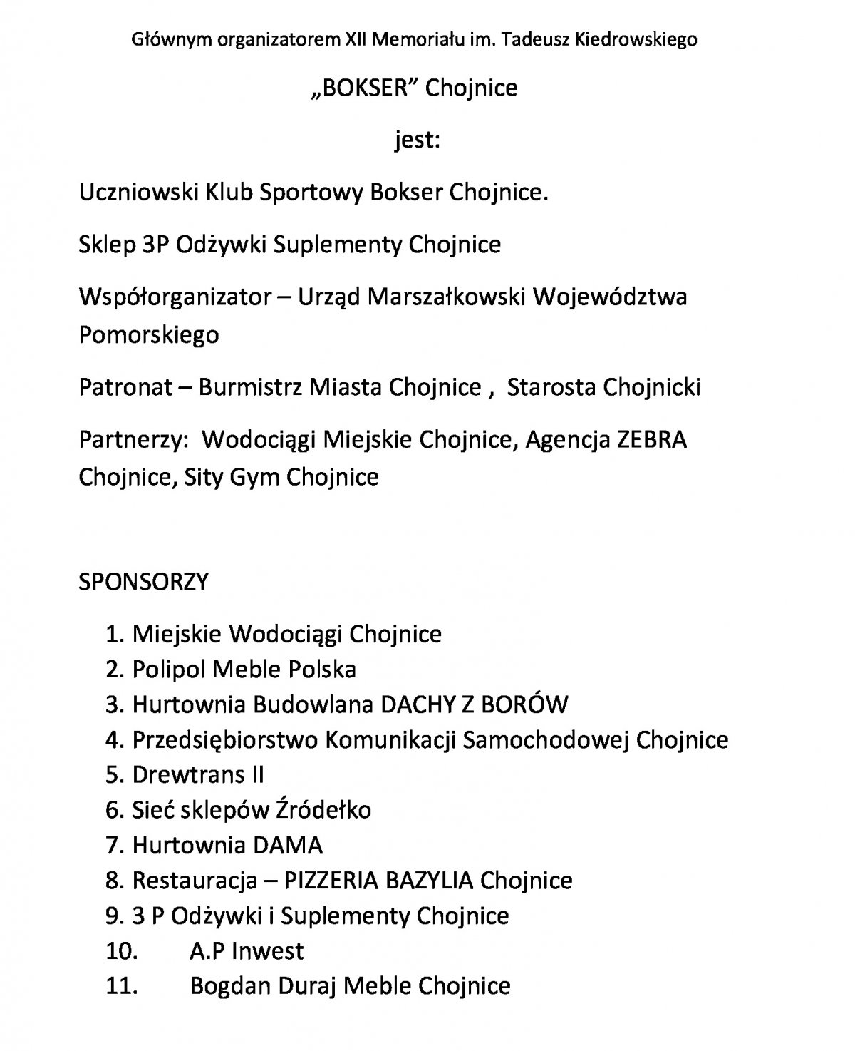 Jestem bardzo wdzięczny wszystkim zaangażowanym osobom dzięki, którym XII Memoriał im. Tadeusza Kiedrowskiego jak co roku przebiegł w bardzo dobrej sportowej atmosferze. Bardzo dziękuję sponsorom, zawodnikom, członkom oraz osobom wspierającym nasz klub. Organizatorzy: Uczniowski Klub Sportowy BOKSER Chojnice. Sklep 3P Chojnice. Urząd Marszałkowski woj, Pomorskiego