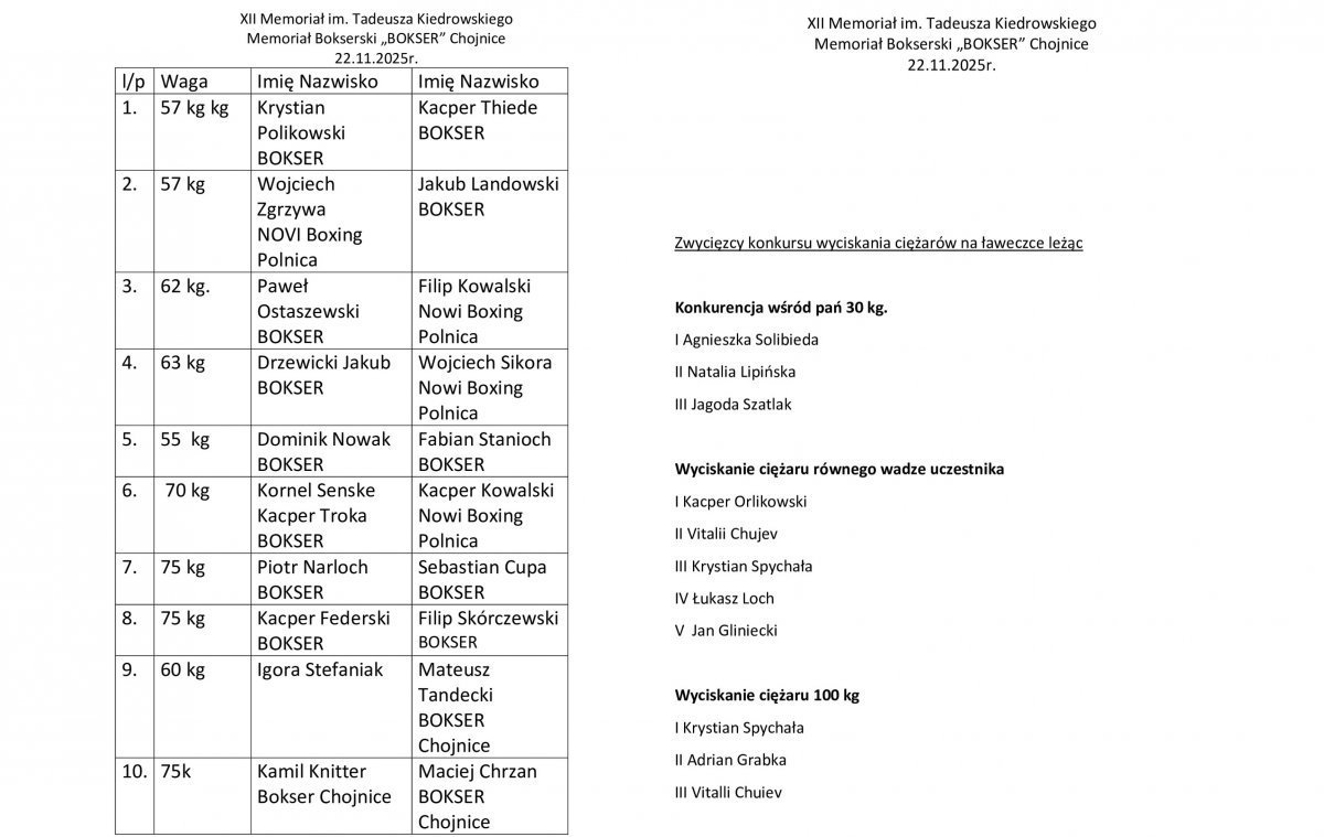 W sobotę 22 listopada w Chojnicach w hali widowisko - sportowej odbył się XII Memoriał im. Tadeusza Kiedrowskiego. Zgodnie z zapowiedzią impreza składała się z dwóch części. Pierwsza pokaz boksu olimpijskiego, druga konkurs wyciskania ciężarów leżąc.
