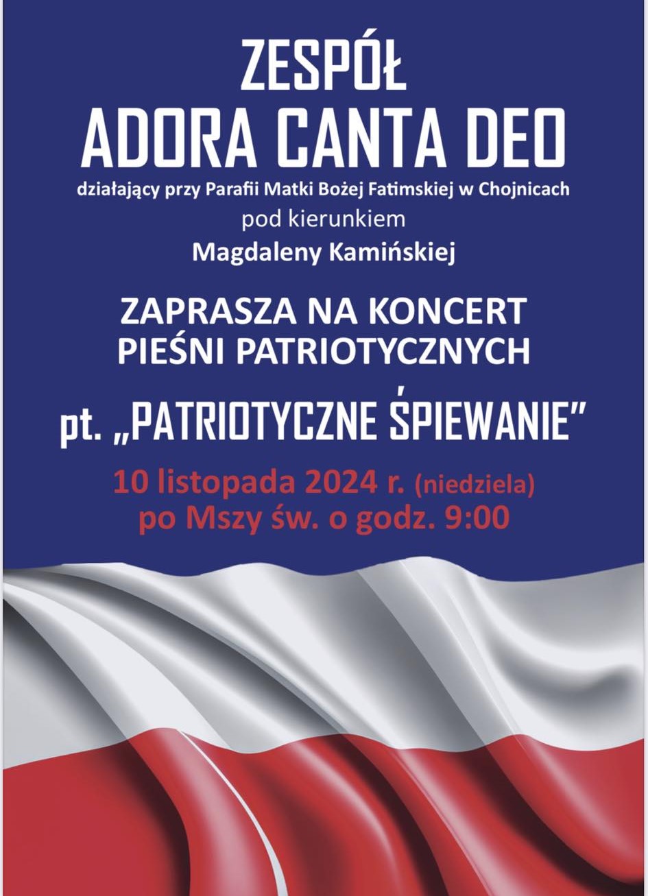 Zespół „Adora Canta Deo” działający przy parafii pw. MBFatimskiej w Chojnicach zaprasza 10 listopada w niedzielę po Mszy św. o godz. 9:00 na koncert pieśni patriotycznych pt. ”Patriotyczne śpiewanie”.