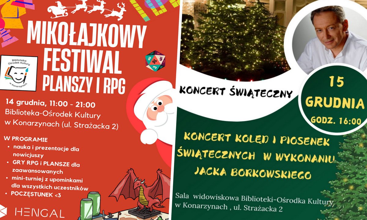 Biblioteka-Ośrodek Kultury w Konarzynach zaprasza na Mikołajkowy Festiwal Planszy i RPG! Odbędzie się 14 grudnia w godzinach od 11 do 21. Dzień później odbędzie koncert kolęd i piosenek świątecznych.