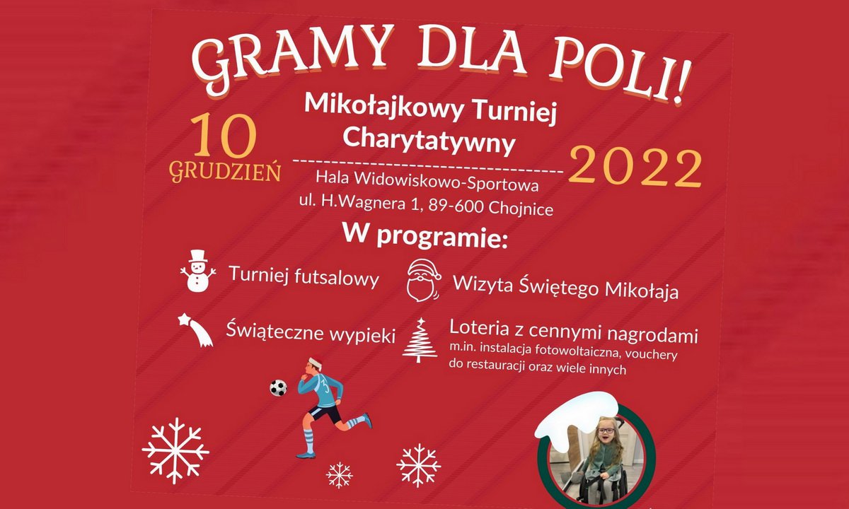 W sobotę 10 grudnia br. w Hali Widowiskowo - Sportowej w Chojnicach odbędzie się futsalowy Mikołajkowy Turniej Charytatywny na rzecz małej Poli. Wydarzenie patronatem honorowym objął Burmistrz Brus i Burmistrz Chojnic. Start o 9.00.